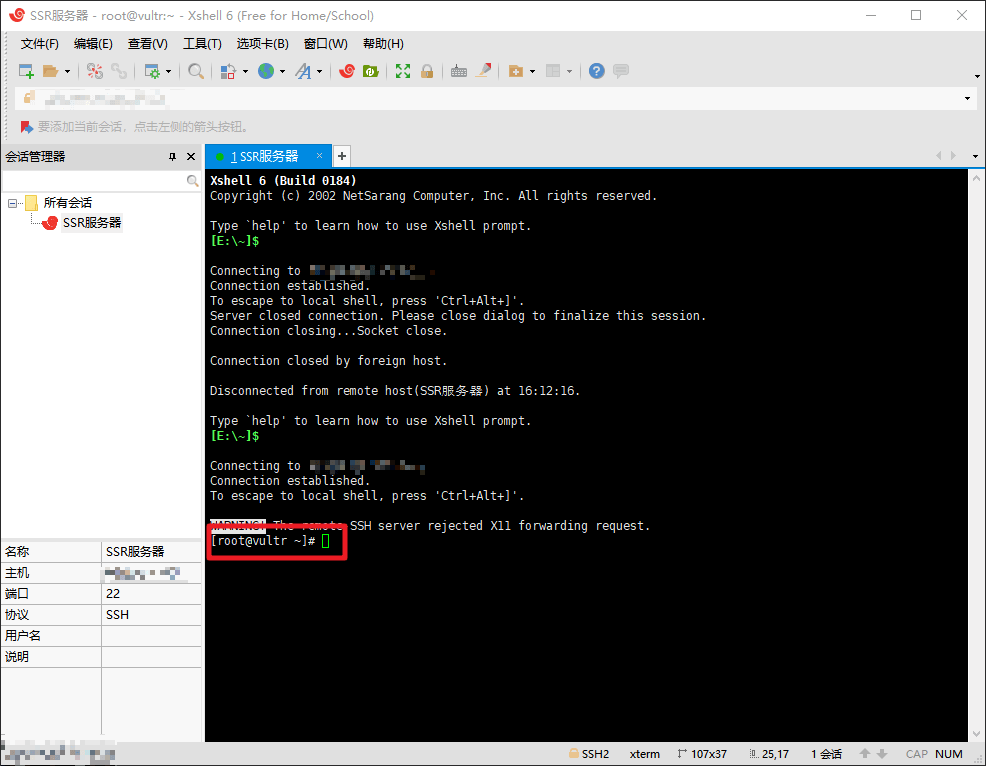 点击文件,新建会话,名称可以随便填,协议为 SSH,主机为你服务器的 IP 地址,点击确定,左侧双击这个会话开始连接,最开始会出现一个 SSH安全警告,点击接受并保存即可,然后会让你输入服务器的用户名和密码,直接在 Vultr 那边复制过来即可,最后看到 [root@vultr ~]# 字样表示连接成功。